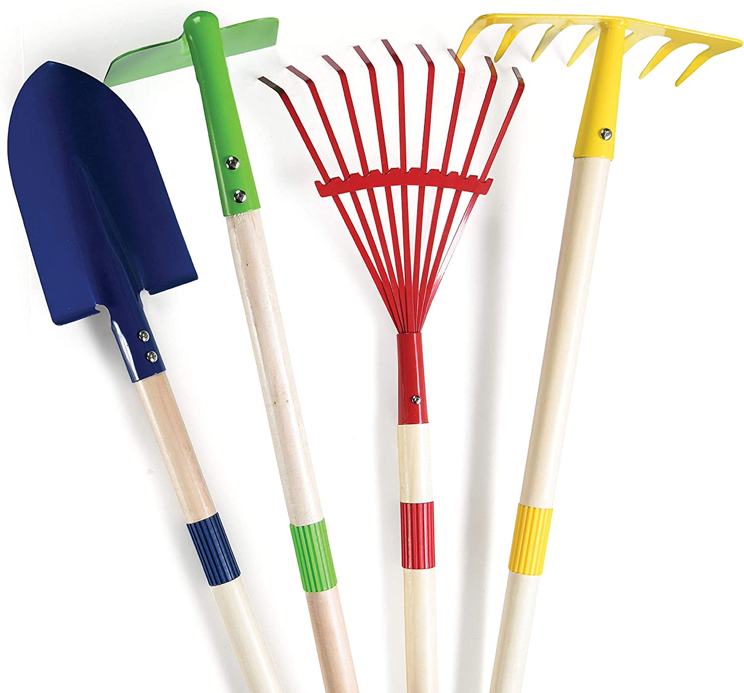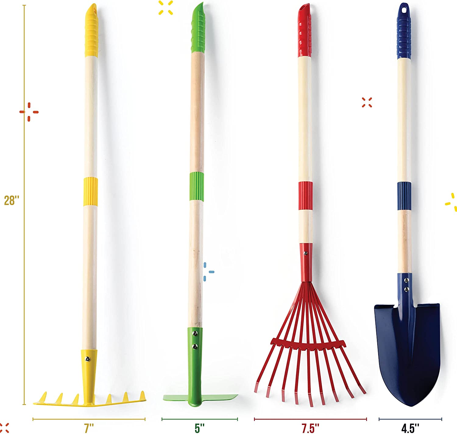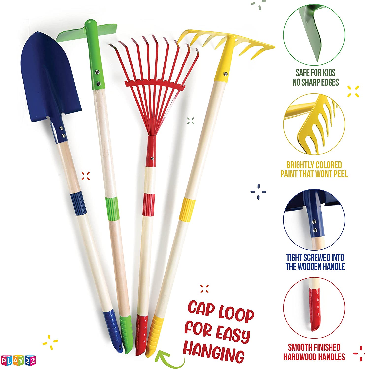 - Play22 Kids Garden Tool Set Toy 4-Piece - Shovel, Rake, Hoe, Leaf Rake, Wooden Gardening Tools For Kids Best Outdoor Toys Gift For Boys And Girls
